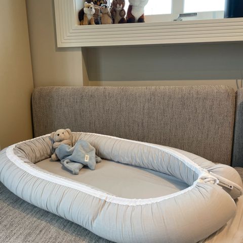 Selger babynest fra Alice & Fox med en avtagbar aktivitetsbue til å henge leker i. Det har et mykt fyll og en høy kant som holder babyen på plass. Babynestet har håndtak i sidene som gjør den enkel å bære. Dette babynestet kan brukes i barnesengen, i vognen, på sofaen eller på gulvet- uansett hvor babyen din trenger et trygt og mykt sted.