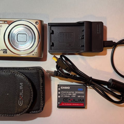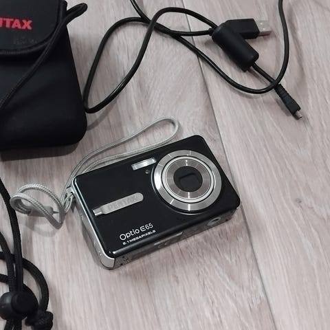 Medfølgende tilbehør som vises på bildene inkluderer Pentax batterilader D-BC8, veske og tilkoblingskabel.