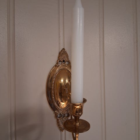 Selger en vintage vegghengt lysestake i messing. Naturlig patina og bruksmerker kan forekommer. Mål: H15cm, D14cm.