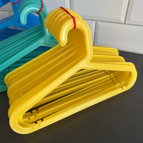 18 stykker IKEA kleshenger i hvitmalt tre. Klassisk modell med buet form som passer til oppheng av ulike typer klær som skjorter, jakker og kjoler. Leveres med metallkrok for oppheng på vanlig garderobestang. Barnestørrelse.