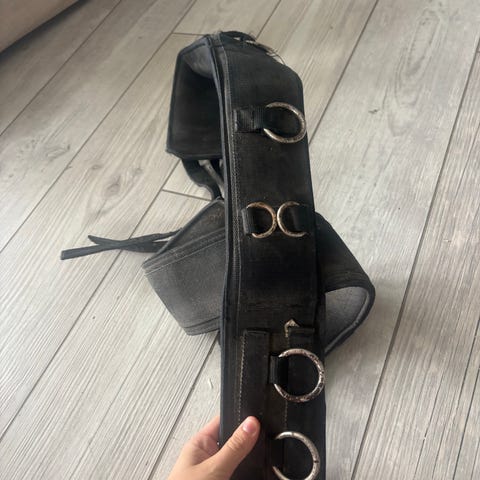 Svart longeringsgjord til hest med flere D-ringer for feste av hjelpetøyler og annet utstyr.