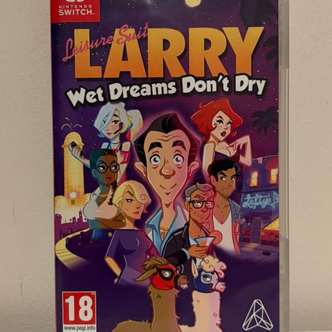 Nintendo Switch Leisure Suit Larry Wet Dreams Dry Twice spill. Fysisk spillkassett i eske til Nintendo Switch. Sjanger: eventyrspill med tegneserieaktig grafikk. Aldersgrense 16 år (PEGI 16). Spillet støtter én spiller og er tilpasset Nintendo Switch-konsoll med håndholdt og TV-modus, avhengig av konsollens innstillinger.
