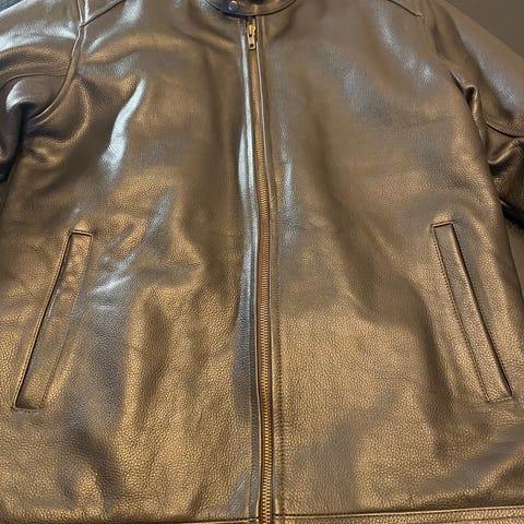 Germot skinnjakke for motorsykkel, herremodell i størrelse 52. Jakken er laget i skinn og har flerfarget design i rødt, hvitt og svart. Den har glidelåslukking foran, brystlomme med glidelås og polstrede partier nederst på ryggen. Egnet som kjørejakke til motorsykkel med klassisk snitt og quiltet innerfôr.