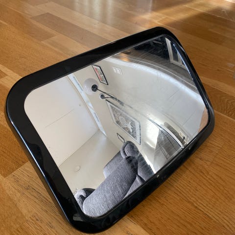 Speil til bilsete for bruk med bakovervendt barnesete. Rektangulært speil med svart ramme og justerbar festeanordning på baksiden. Festes til bilens baksete med stropper for å gi fører eller passasjer mulighet til å se barnet i bakovervendt sete via bakspeilet. Egnet til bruk i personbil på nakkestøtte i baksetet.