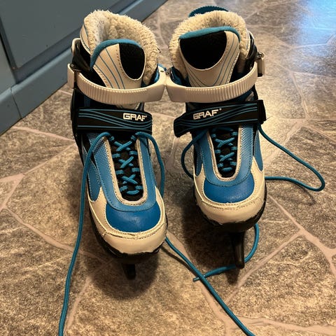 Graf ishockeyskøyter for barn i blå og hvit farge. Skøytene har snøring kombinert med borrelåsreim og spennelukking for god tilpasning rundt foten. Myk, polstret innersko gir støtte og komfort rundt ankel og vrist. Blad i metall egnet for bruk på ishockeybane og andre isflater. Passer til barn som trenger stabile skøyter til lek og enkel ishockeytrening.