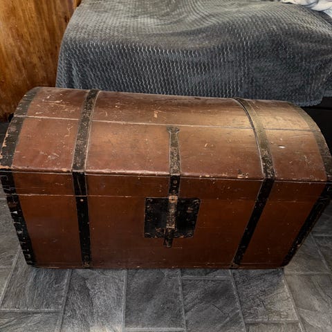 Malt trekiste med buet lokk og dekor. Kisten er laget i tre og er utvendig malt i rustrød farge med grønne, profilerte bånd og dekorative detaljer. Fronten har malte årstall og initialer, og innsiden av lokket er dekorert med mønster i tilsvarende farger. Innvendig har kisten et mindre rom/skuff langs den ene siden for oppbevaring av mindre gjenstander. Egner seg til oppbevaring av tekstiler, utstyr eller som møbel og interiørdetalj.