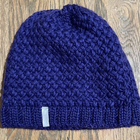 Blå Bergans lue i ullblanding i one size. Strikket struktur med ribbekant nederst og Bergans-logo på