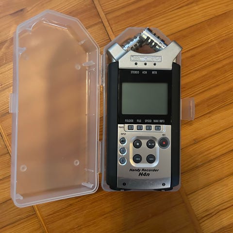 Zoom H2 håndholdt lydopptaker i sølv. Bærbar digital opptaker med innebygde mikrofoner og frontpanel med display og kontrollknapper. Enheten har tilkoblinger for hodetelefoner, linje inn, ekstern strømforsyning og USB. Det følger med strømadapter, bordstativ og oppbevaringspose. Egnet for opptak av tale, intervjuer, øving og andre lydopptak der en kompakt opptaker er praktisk.