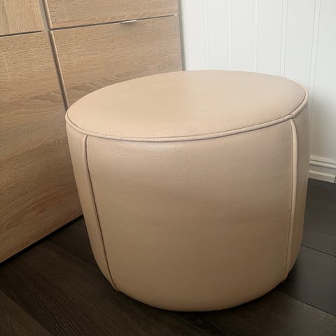 Selger en pent brukt sittepuff i myk velur. Puffen har en nøytral farge som passer inn i de fleste hjem. Fin som ekstra sitteplass, fotskammel eller dekorasjon. Fin på barnerommet også, lett å flytte på.