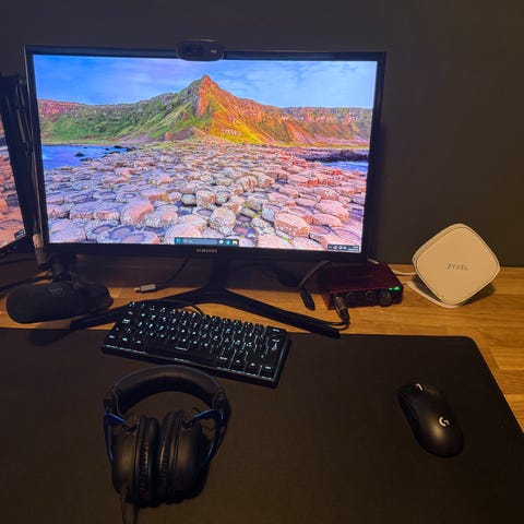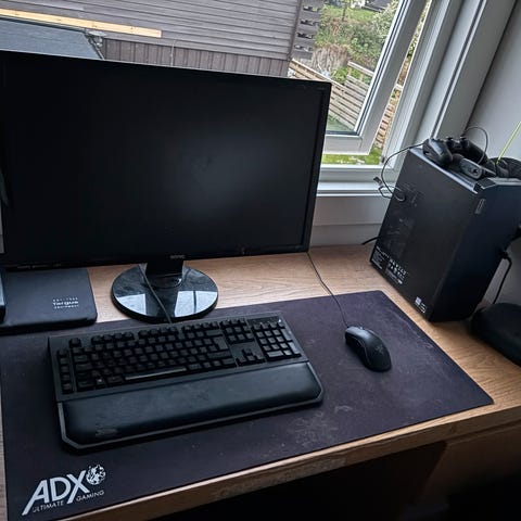 To skjermer av merket Lenovo og en Dell dokking, en fint oppsett for enkelt hjemmekontor. Skjermer har ikke føtter, men det følger med et stilrent oppheng som festes i bordkanten. Tastatur og mus følger ikke med. Må hentes. Kom gjerne med bud