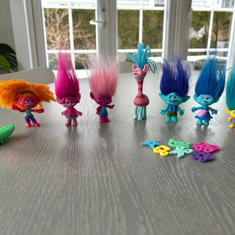 DreamWorks Trolls figur med rosa hår og rosa kropp. Figuren har blå og grønn kjole og er laget i plast. Egnet som lekefigur eller samlefigur for barn som liker Trolls-universet. Figuren er liten og lett å ta med seg, og kan brukes sammen med andre Trolls-figurer og lekesett.