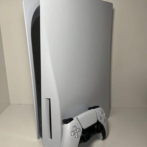 Xbox Series S spillkonsoll, med tilhørende strøm- og tilkoblingskabler samt tre trådløse kontrollere, to svarte og én hvit. Lade Dock medfølger for 2 av kontrollene, den siste har batterier.
