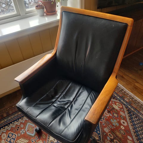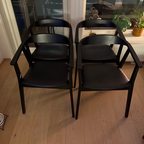 Fora Form besøksstol / lenestol med understell i krom, håndtak i bøk, og trukket i sort skinn, pent brukt, hel og pen stol.
