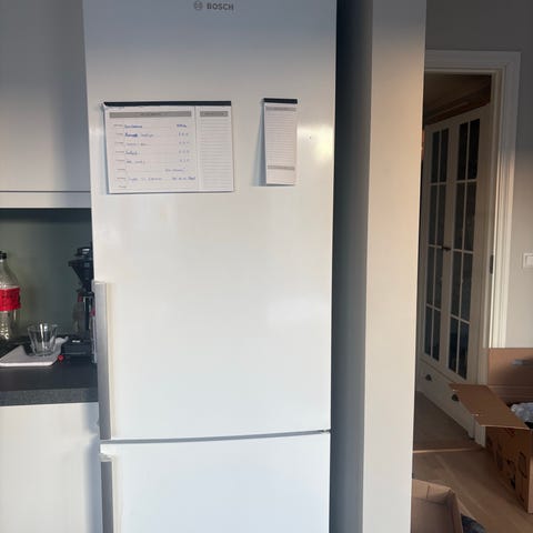 Bosch KGE36AW40 kombiskap i hvit utførelse. Kombiskapet har kjøledel øverst og frysedel nederst. Frysedelen har tre gjennomsiktige skuffer for oversiktlig lagring av frossenvarer. Kjøledelen har flere glasshyller, grønnsaksskuff og dørhyller for flasker og mindre produkter. Passer til vanlig frittstående plassering på kjøkken eller i bod. Modellbetegnelse: KGE36AW40.