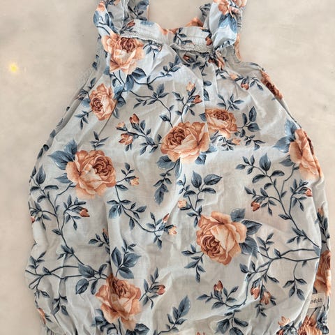 Superfin playsuit/kort selebukse str 86 fra Wheat. Størrelsen bommet på sesong, så vi fikk ikke brukt den.