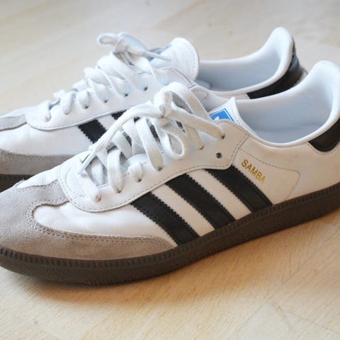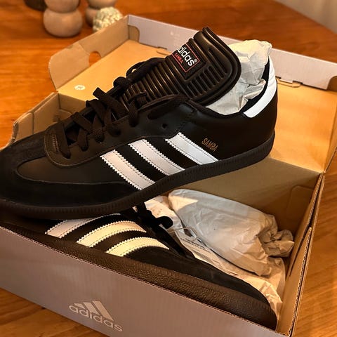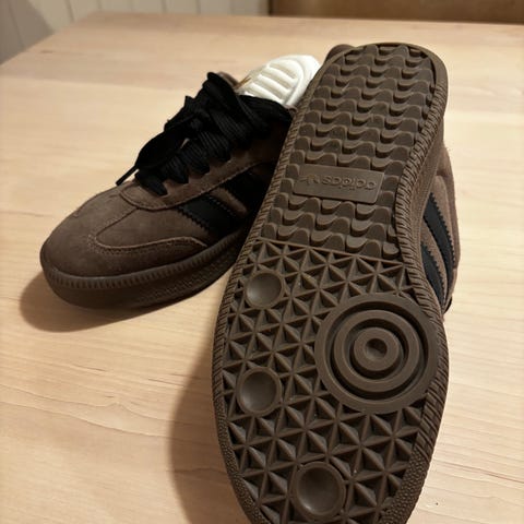 Adidas Samba sneakers i størrelse 43. Skoene har svart lisser, hvit hælkappe og gummisåle. Klassisk joggesko/sneaker som passer til hverdagsbruk. Dem er pent brukt og ser ny ut.