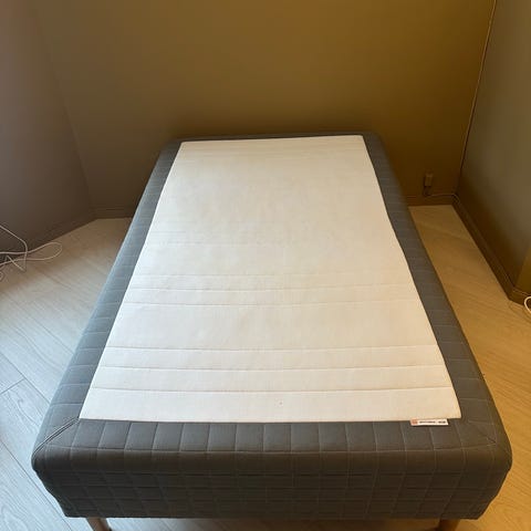 IKEA seng med madrass i hvit farge. Rammemadrass med overmadrass. Passer til soverom, gjesterom eller hybel. Nøytral, lys tekstiltrekk og enkel, rett utforming som gjør den lett å plassere mot vegg eller i hjørne. Står på ben som gir plass under sengen til enkel rengjøring eller oppbevaring.
