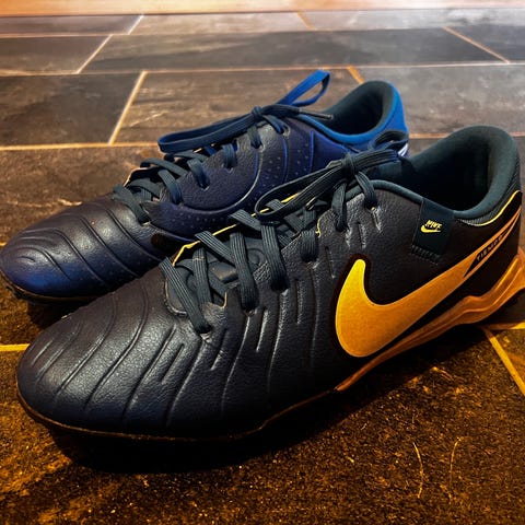 Nike Tiempo Legend fotballsko. Overdel i syntetisk materiale med strukturert overflate for bedre ballkontroll. Yttersåle med faste knotter. Snøring i front og polstret hælparti for stabilitet og komfort. Fargekombinasjon hvit og metallisk grønn.