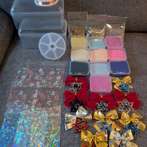 Perlesett og dekorasjonsmateriale til hobby og smykkelaging i flere farger. Settet inneholder små perler i ulike pastell- og basisfarger oppbevart i plastbokser og poser, samt stjerneformede anheng dekorert med perler og sløyfer i rødt og gull. I tillegg følger det med gjennomsiktige dekorark med mønster og en rund oppbevaringsboks. Egnet til hobbyprosjekter som smykkelaging, dekorasjoner, gavelapper og andre kreative prosjekter.