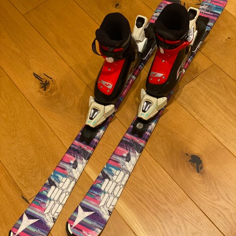 Selger alpinski og støvel etter barna. Passer til barn med sko størrelse 31-32 og ski har lengre på 100cm.