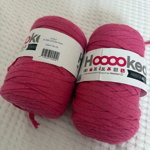 Hoooked Ribbon XL garn og heklenål 12 mm i beige og rosa.