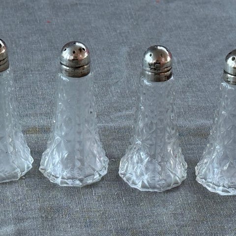 Nydelig salt og pepperbøsse i sølv og slipt krystall