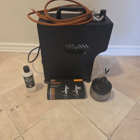 Selger kompressor med Airbrush. Fungerer som det skal og kompressor leverer godt med trykk. Airbrush er av lavere kvalitet, men fungerer helt optimalt. Jeg har pusset nål med sandpapir og jeg har minimalt med at malingen tørker på nåla, men sannsynligheten er større med denne sprøyta.
