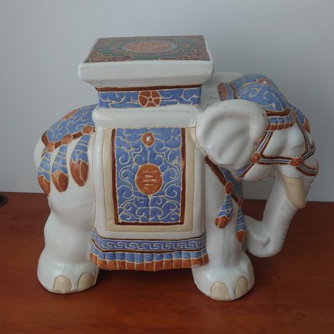 Elefant keramikkfigur i svart og hvit. Figuren er utformet som en stående elefant med dekorative mønstre på sidene og på sokkelen. Passer som pyntegjenstand på bord, hylle eller i vinduskarm. Materialet fremstår som glasert keramikk med kontrastfarger som fremhever detaljene i utformingen.