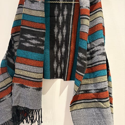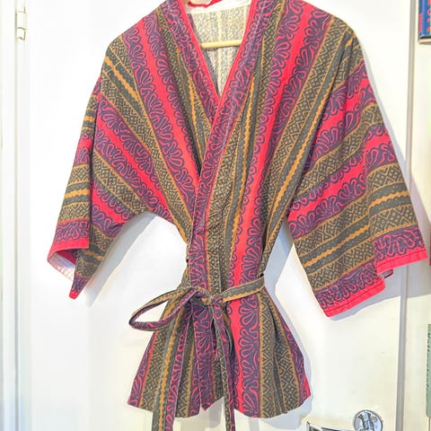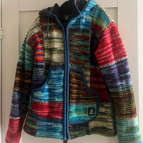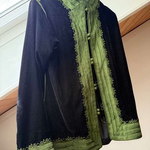 Den er er veldig fin tradisjonell jakke fra Marrakesh( Marokko). Den mangler en knapp på enden men jakka har glidelås.