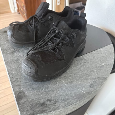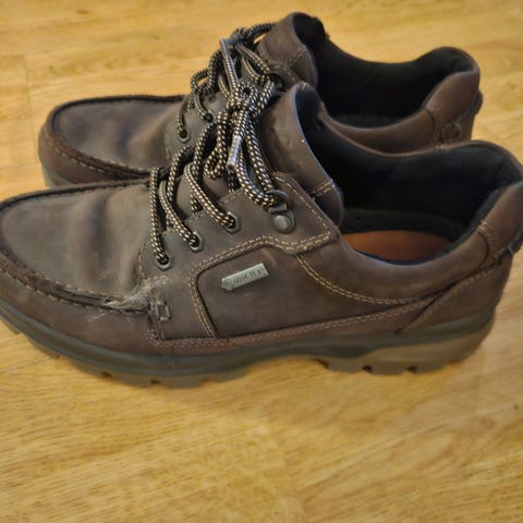 Ecco sko i størrelse 42. Modellen er lav og har kraftig yttersåle med grovt mønster. Skoene er svarte med snøring foran og hempe bak for enklere av- og påkledning. Passer til bruk i hverdagen og til turer der det er behov for godt grep. Materiale og innvendig fôr er ikke spesifisert.