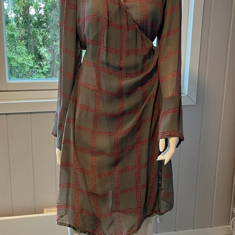 Lang skjorte fra Marimekko i rød og mørk blå. Skjorten er 100% silke. Den er fin både åpen og lukket og kan brukes i mange variasjoner. Kanskje også som en kort sommerkjole med/uten belte?