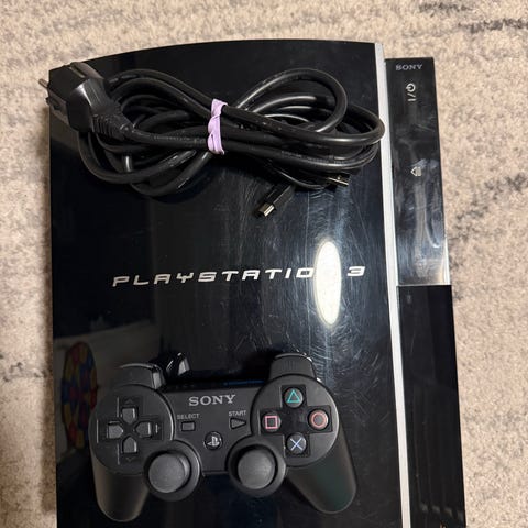 Sony Playstation 3 spillkonsoll i svart. Konsollen leveres med én original Sony håndkontroller og tilhørende kabler som vist på bildet. Egnet for avspilling av Playstation 3-spill, filmer og annet multimediainnhold, samt tilkobling til TV via medfølgende kabler.