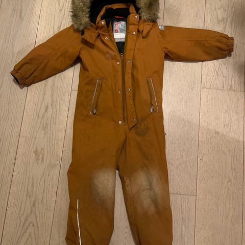 Knallgod vinterdress fra Reima i den fine fargen Cinnamon. Kjøpt ny, brukt en sesong av et barn. Litt slitt i fargen rumpe og knær, men ingen hull eller rifter. Solid dress som tåler godt fuktige vinterdager og masse aking☺️