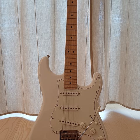Lufter denne flotte Stratocasteren produsert i Japan 1984-1986. Fantastisk finish og utrolig lettspilt gitar satt opp av proff gitarmaker. Han mente strengelåser på headstock var overflødige, og har avmontert disse.