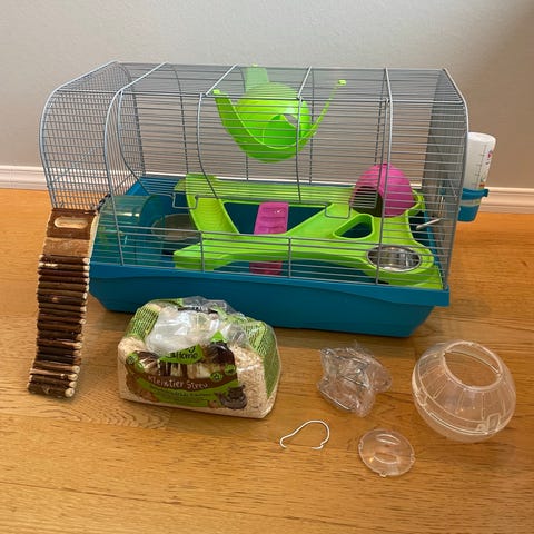 Hamsterbur med plasttunnel og tilbehør