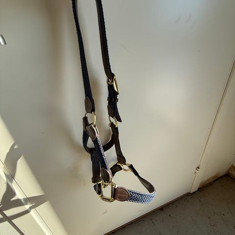 Ny og ubrukt grime med leietau. Den ser sort ut, men er egentlig veldig mørk blå. Størrelse cob.