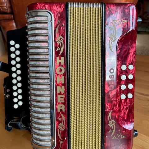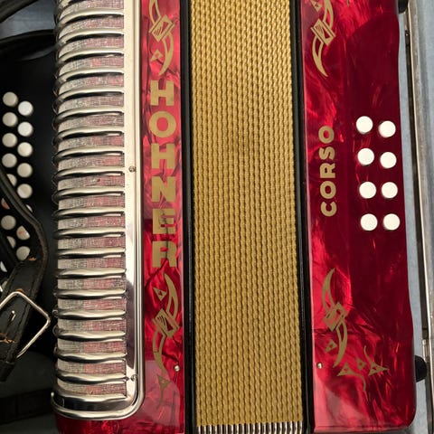 Hohner Corso som framstår som heilt ny. Antakeligvis frå 1970/1980-talet. Toneart: CF. Med halvtonar og to gode skulderreimer. Tett belg og ingen skadar. Fylgjer ikkje med koffert/sekk,men kan få med den originale pappkassen som toradaren kom i.