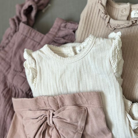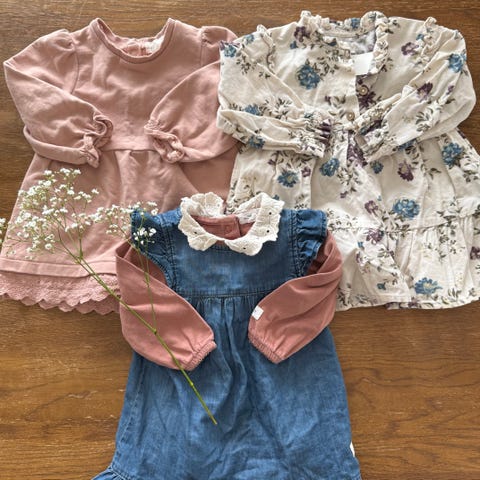 Ett sett med body + bukse, ett sett med kjole + tights, og tre bodyer.