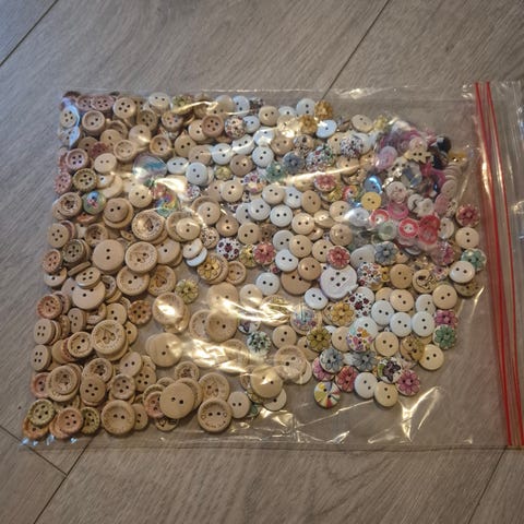 900 nye/ubrukte knapper selges samlet. Plastknapper og treknapper. Du får det som er på bildene. Kommer samlet i en pose (se siste bildet)