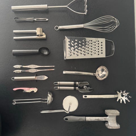 IKEA kjøkkenredskaper sett. Inneholder ulike redskaper som rivjern, kniver, ostehøvel, visp, sleiver og serveringsredskaper, samt målebeger og sil. Godt brukt, selges samlet