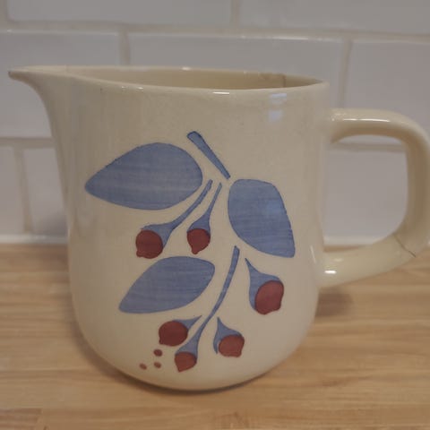 Kanne/vase i porselen i rosa farge med blomsterdekor på siden. Kannen har hank og helletut, samt innvendig glasur i rosatone. Formen er svakt kantet/oktagonal. Egner seg til servering av for eksempel vann, saft eller andre drikker, eller som dekorasjonsgjenstand i servise eller på kjøkkenet. Eller til blomster.