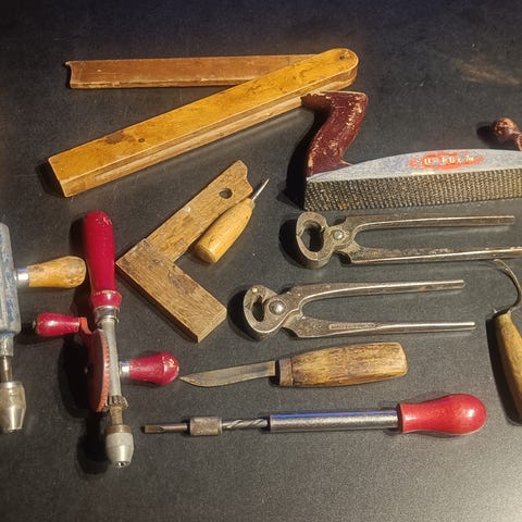 Diverse gamle kjøkken- og håndverktøy metall og tre