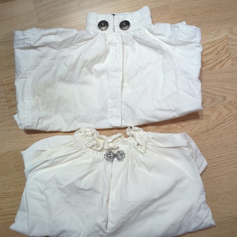 Meget pene, ingen skader/flekker. Veldig fin stå-krage med «kniplinger». Str 122, men veldig store i str.