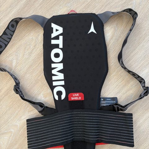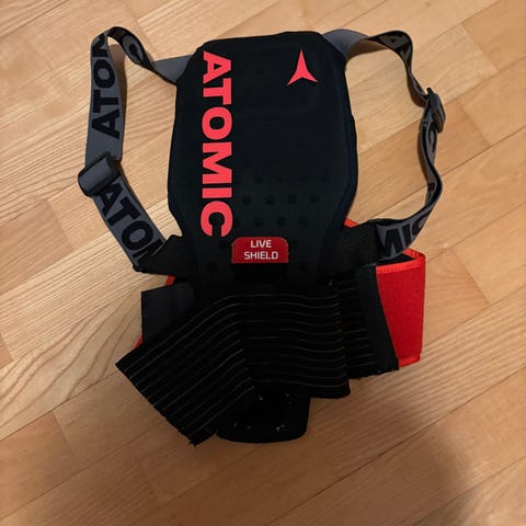 Atomic Live Shield ryggbeskytter for junior i størrelse JS. Modellen har elastiske skulderstropper med Atomic-logo og bredt midjebelte med borrelås for justering og god passform. Fargekombinasjon svart og rød. Yttermateriale i nylon med innslag av gummi- og elastanmateriale, og polstret ryggplate konstruert for støtdemping ved ski- og snowboardbruk eller annen vintersport der ryggbeskyttelse er ønskelig.