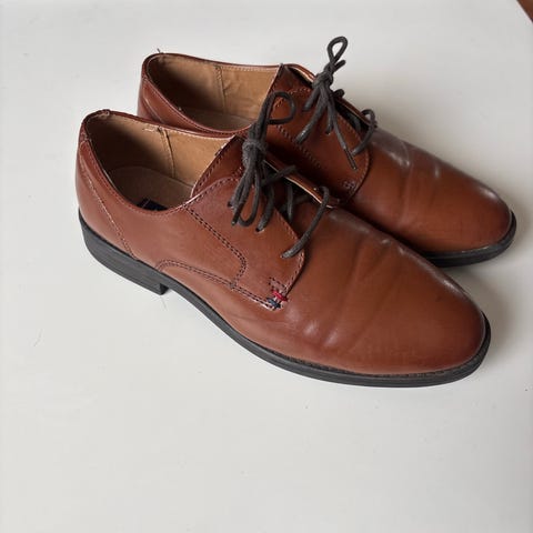 Brune pensko / dressko i skinn til gutt str. 38. litt stor i størrelsen. Ganske pent brukt, men noen små bruksmerker på tuppen og litt slitte lisser (mangler endeteip).