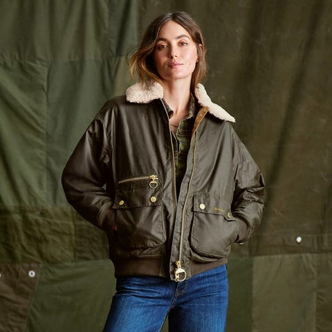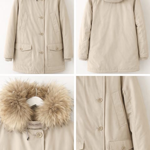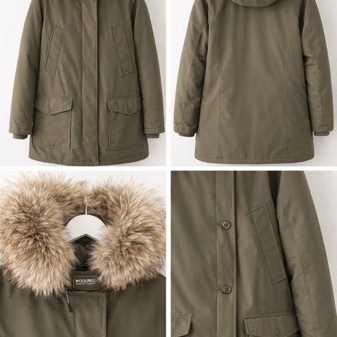 Stilren army-grønn jakke med klassisk snitt og avtagbar pelskrage.
