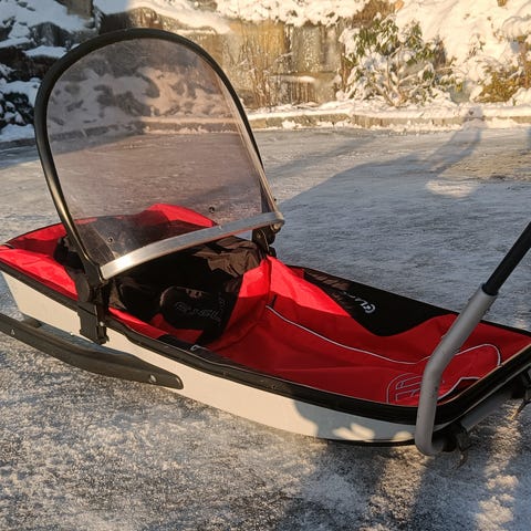 Komplett barnepulk med vindskjerm, drag og sele. Normal bruk (noen bruksmerker), men i god stand.