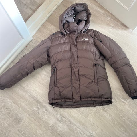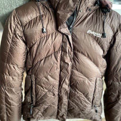 Vintage Bergans jakke i gull/brun i str XS. Fremstår som ny, og har mange mange år igjen. Super god og varm jakke. Innerlomme med pose å pakke den inn i. 2 lommer og håndvarmere, hetten kan også rulles inn.