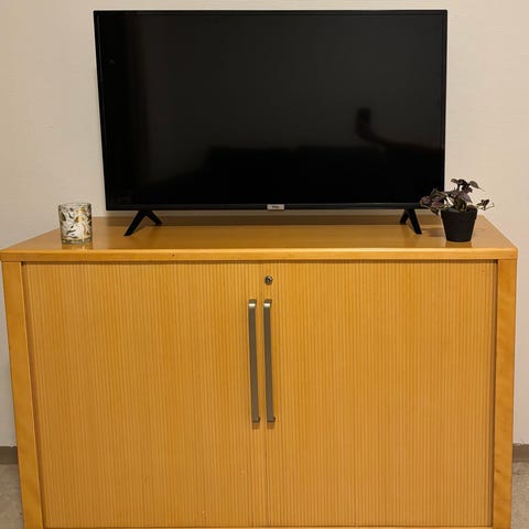 God heltre TV-benk på hjul. Målene som er oppgitt er «ca». Eldre Panasonic TV kan følge med ønskelig.