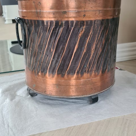 Stor, hel og fin kobber veddunk fra Hamre. Den er norskprodusert laget av hamret kobber med detaljer i smijern. Har 2 hele og gode bæreringer, og står på ben. Veddunken er brukt, men er like solid og bra. God størrelse på den; 38 cm diameter og 35 cm høy. Denne trenger garantert en omgang med kobberpuss for å skinne igjen. Må hentes på Solløkka i Sandefjord.